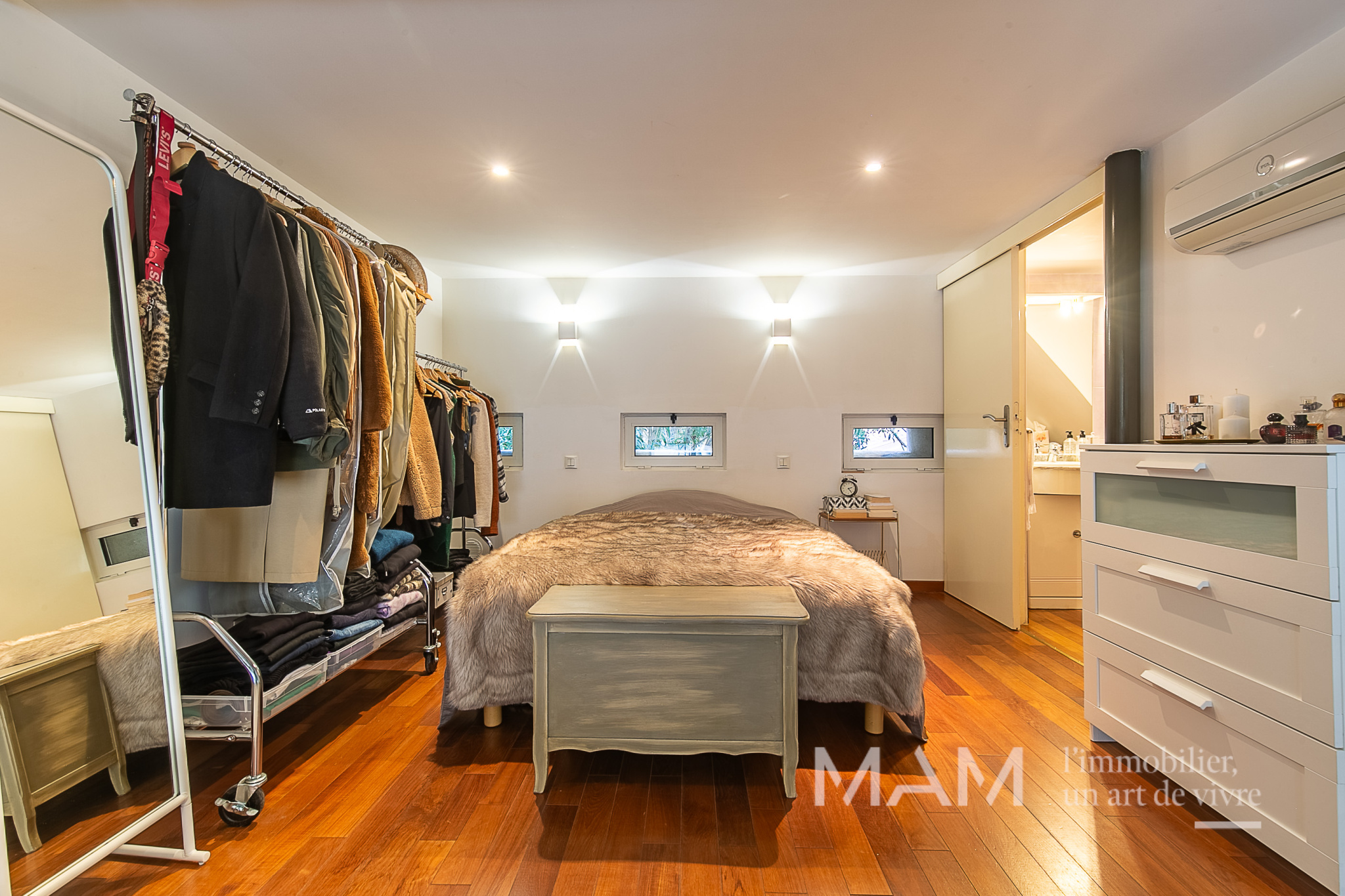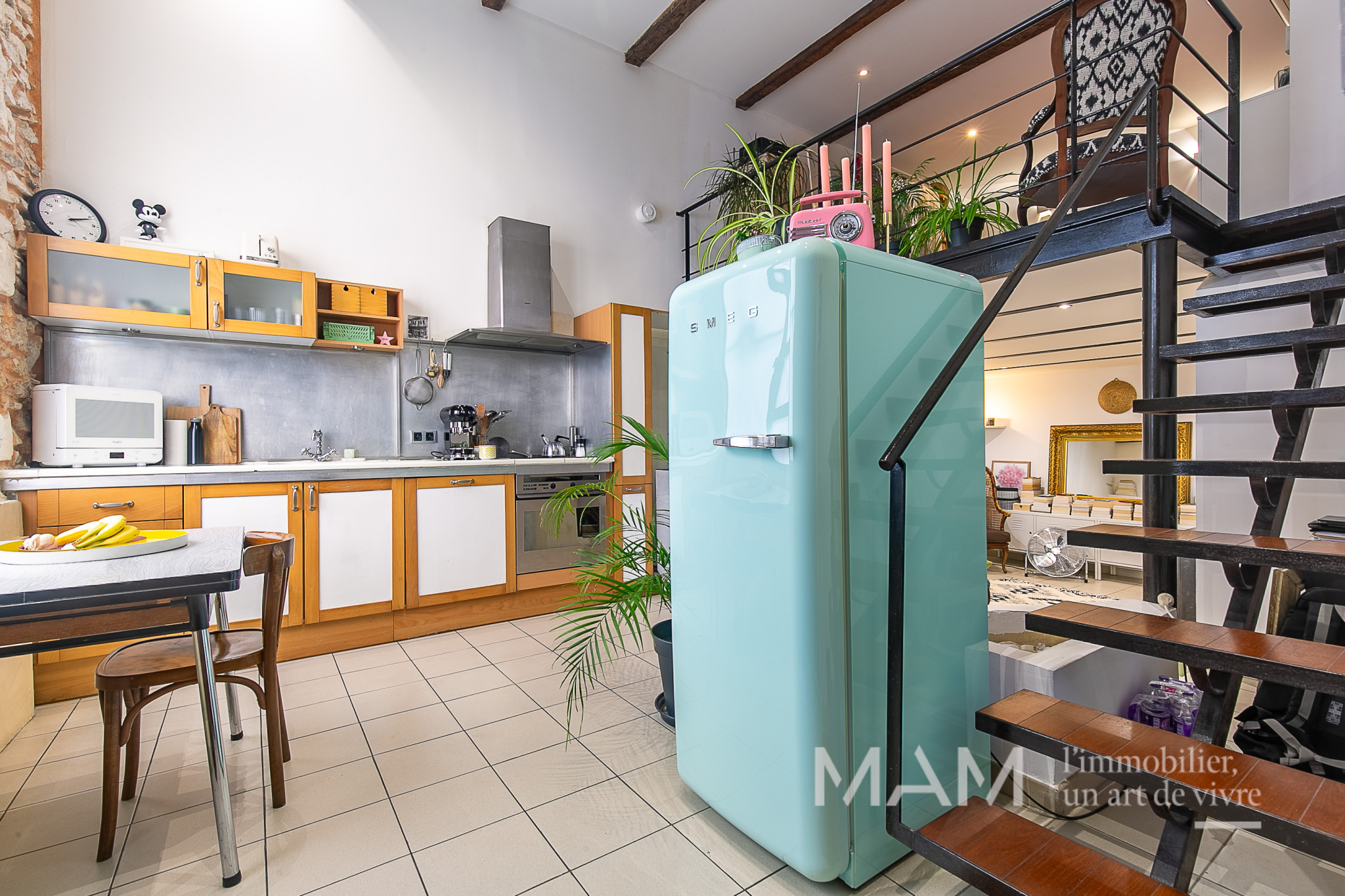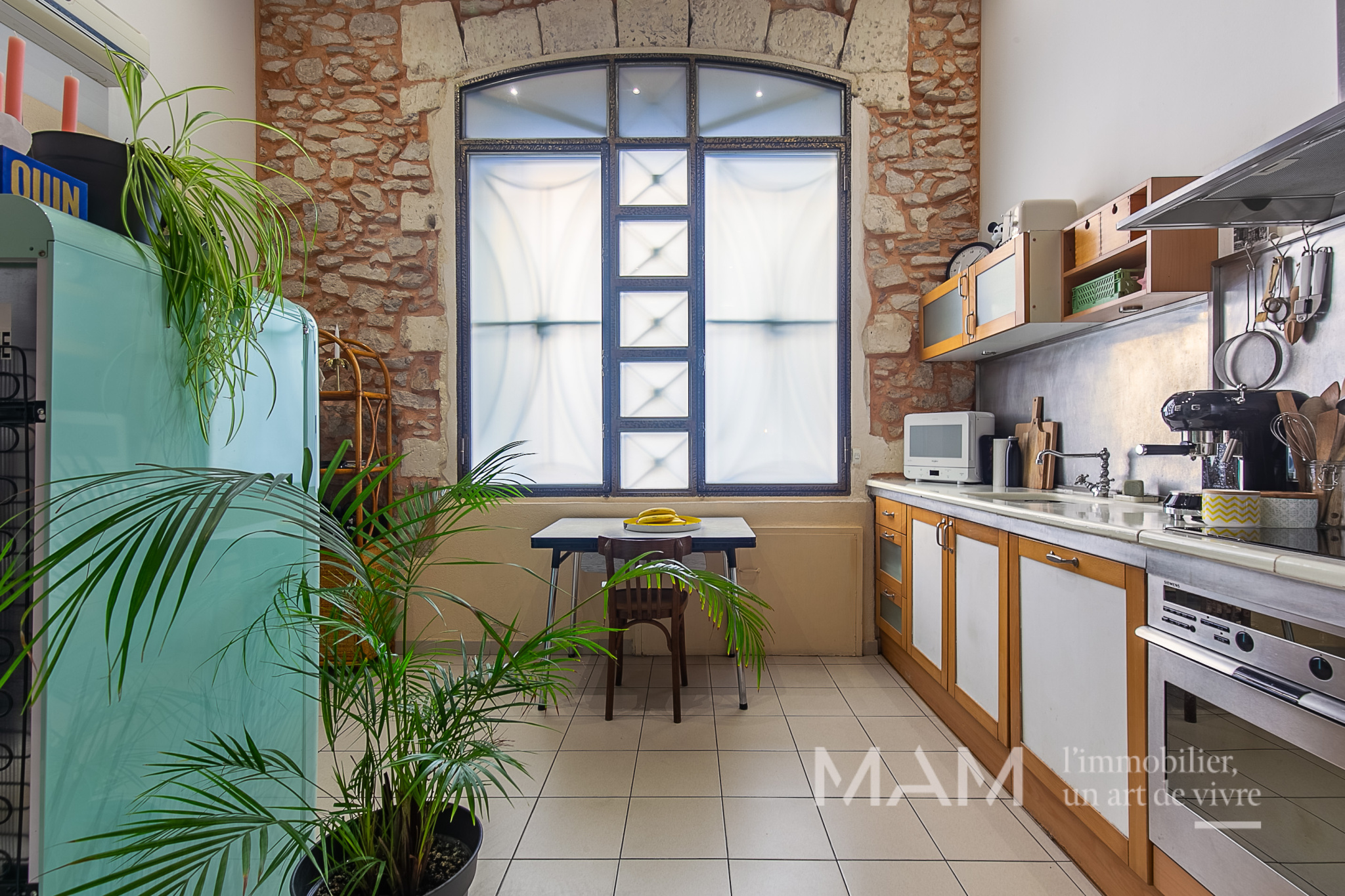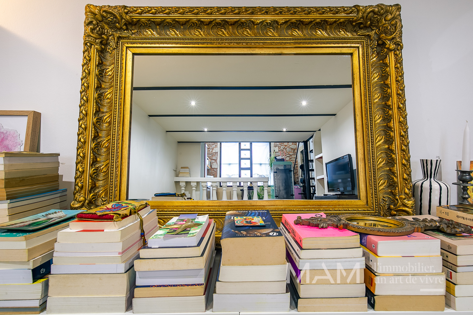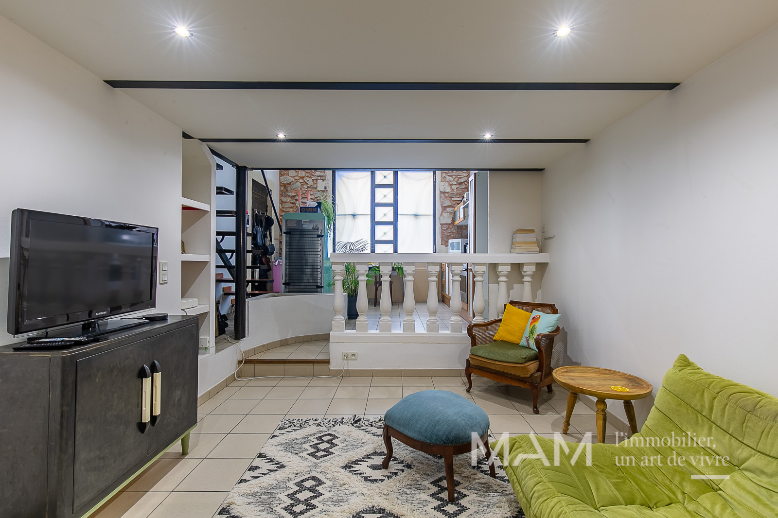 Vous entrez par l'espace central en RDC avec sa verrière de caractère puis quelques marches vous mènent à un deuxième espace agrémenté d'un placard et d'un espace (aujourd'hui buanderie) transormable en kitchnette ou douche. La pièce en mezzanine est dotée de petites fenêtres sur jardin. Petite copropriété de 3 lot.