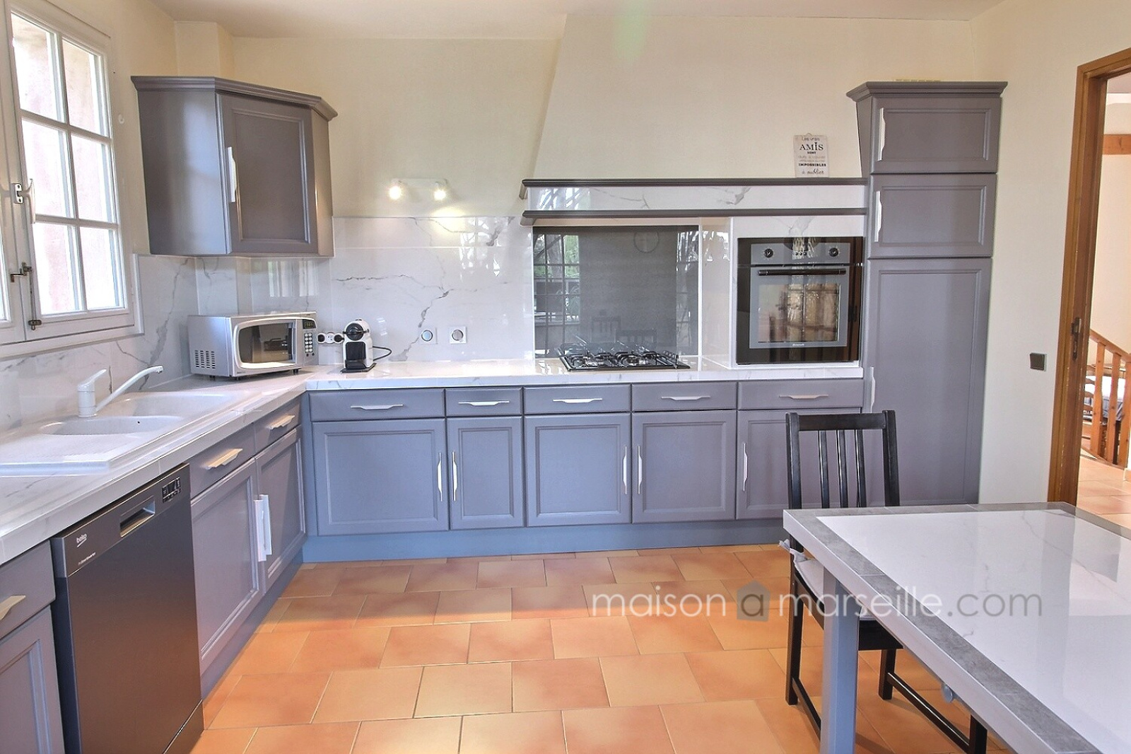 La cuisine équipée de 20 m2 ouvre elle sur une autre terrasse exposée nord et permet de déjeuner à l'ombre en période estivale.