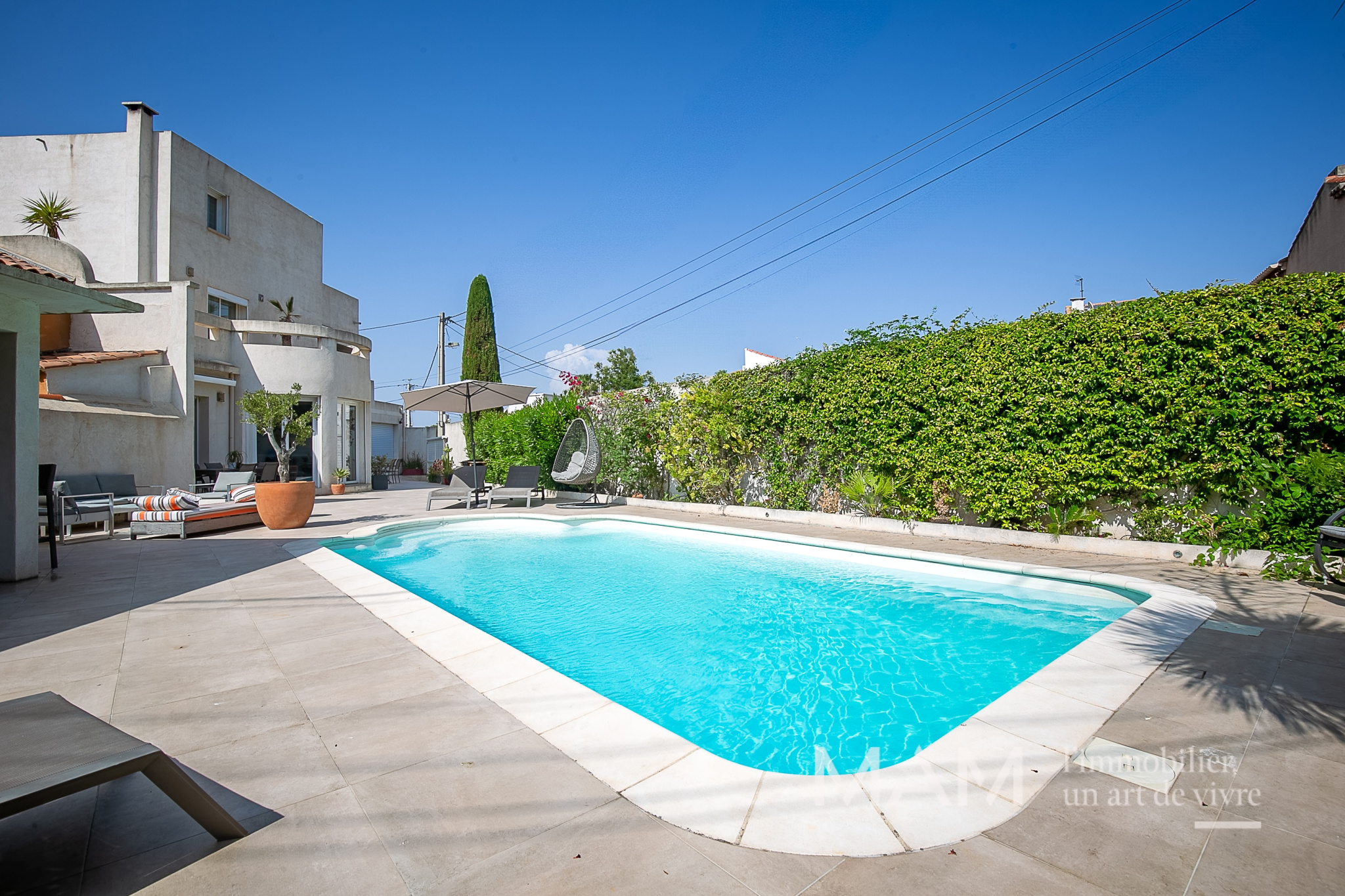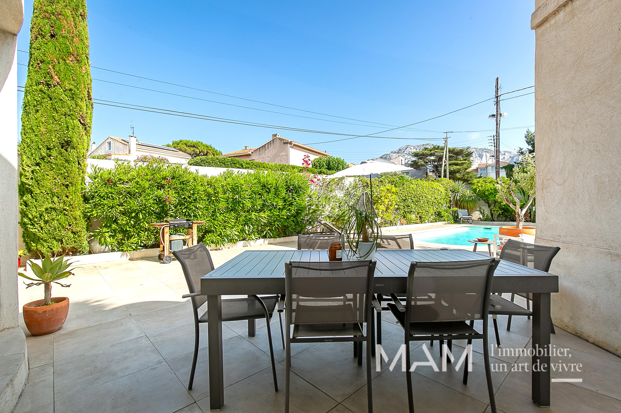 L’extérieur est agréable et bien exposé : piscine avec pool house, terrasse et espaces arborés, un cadre parfait pour partager des moments en famille ou entre amis, comme en vacances.