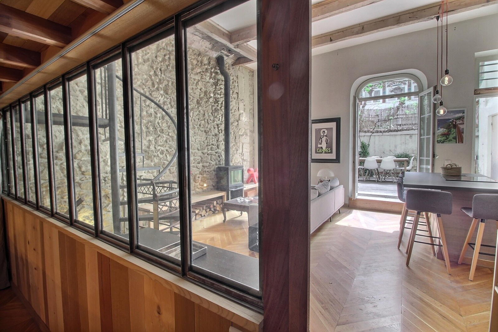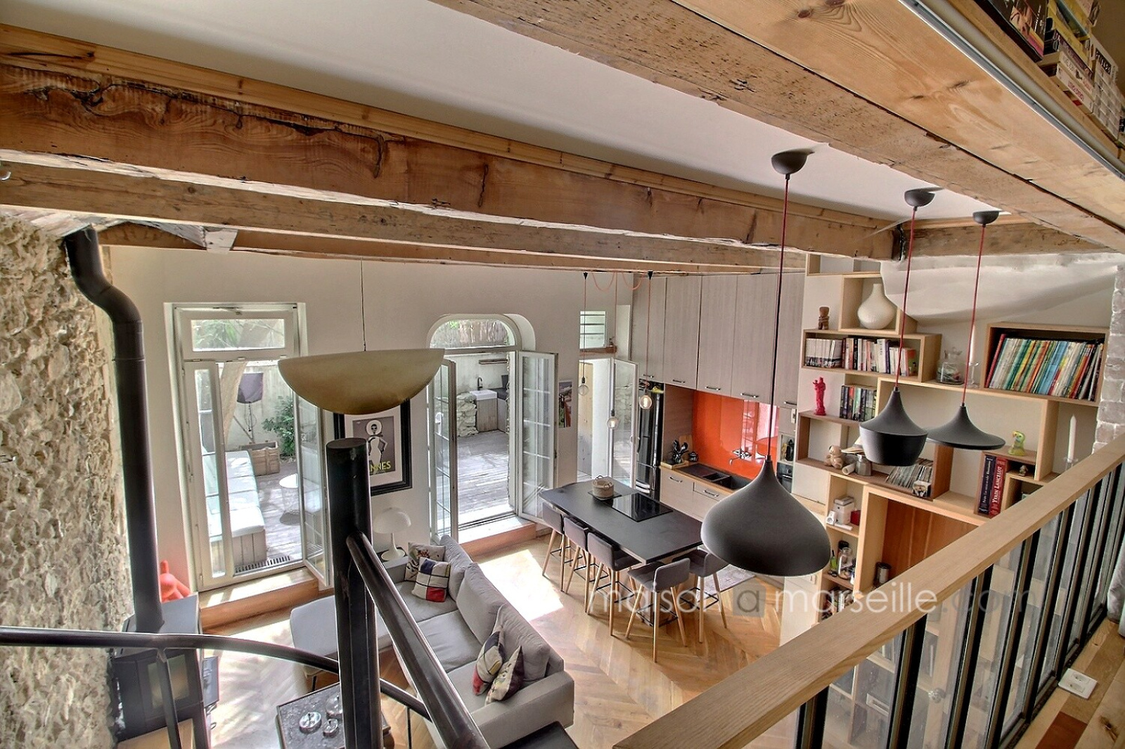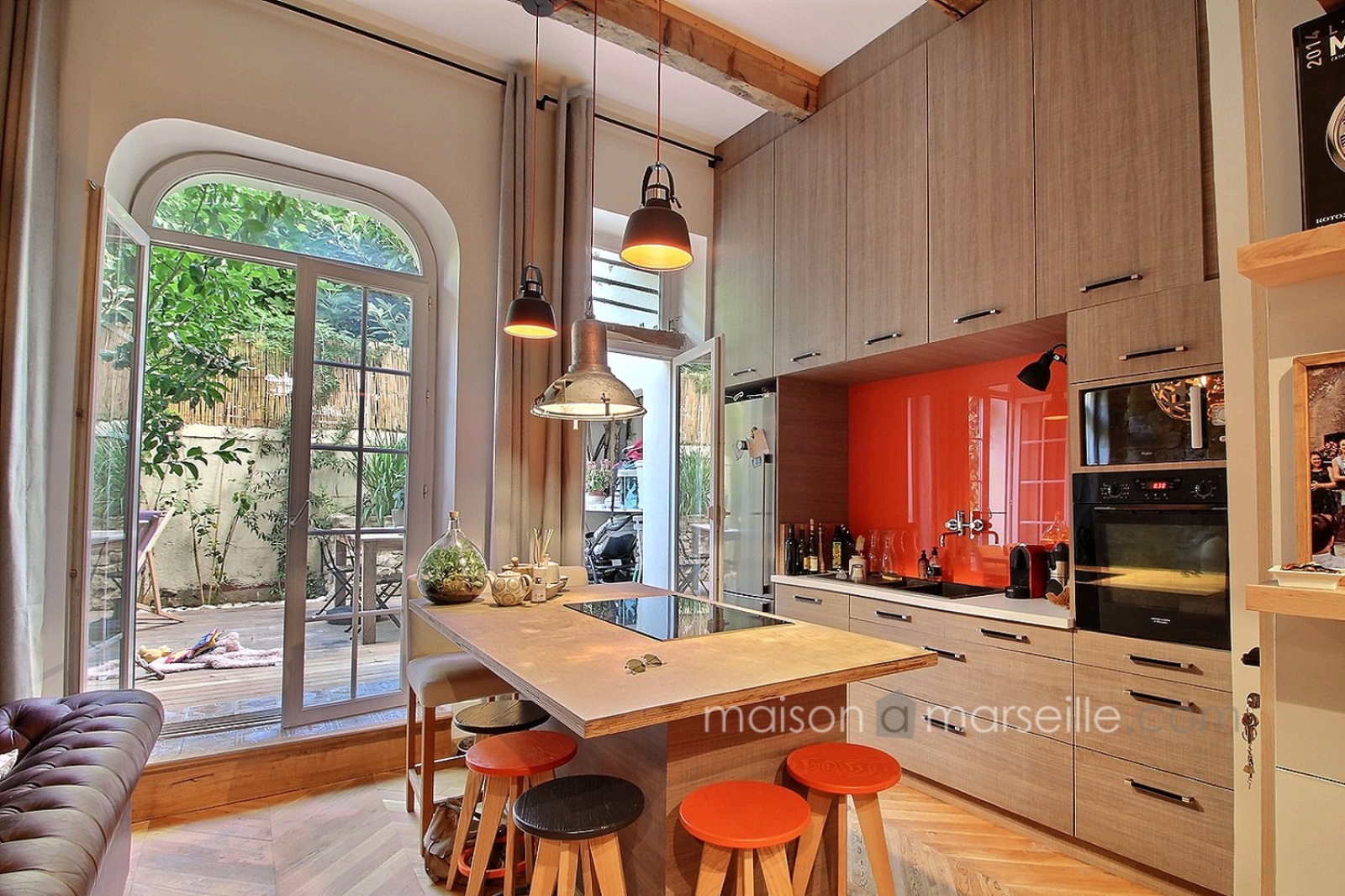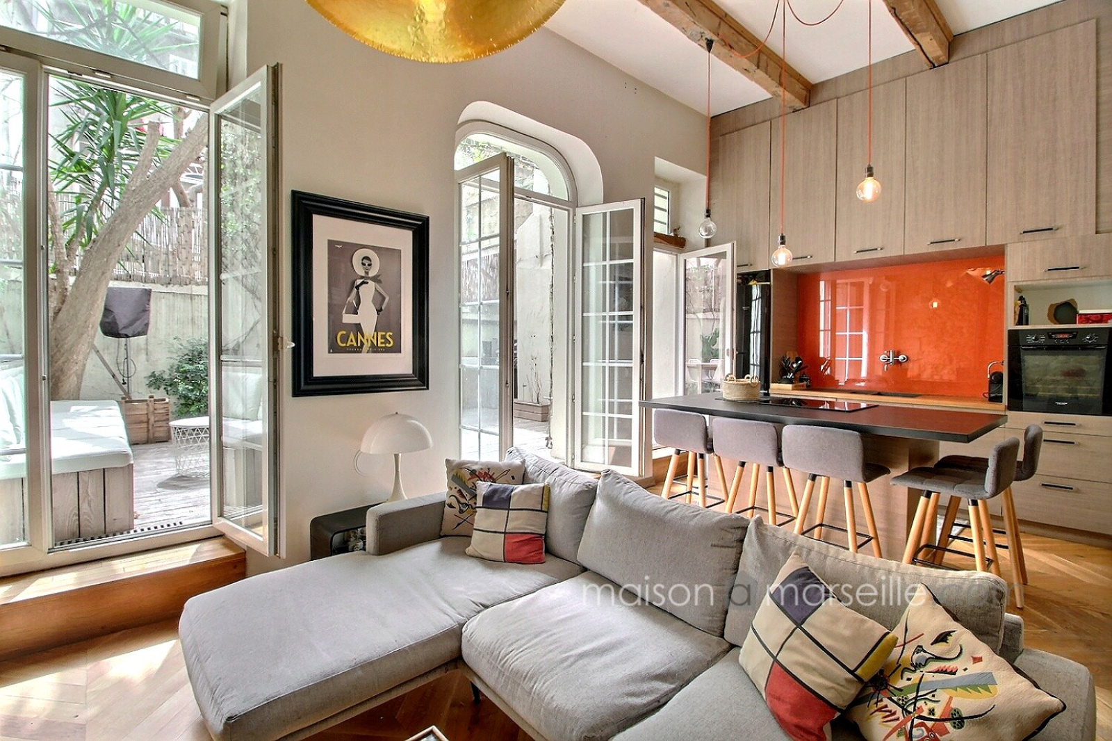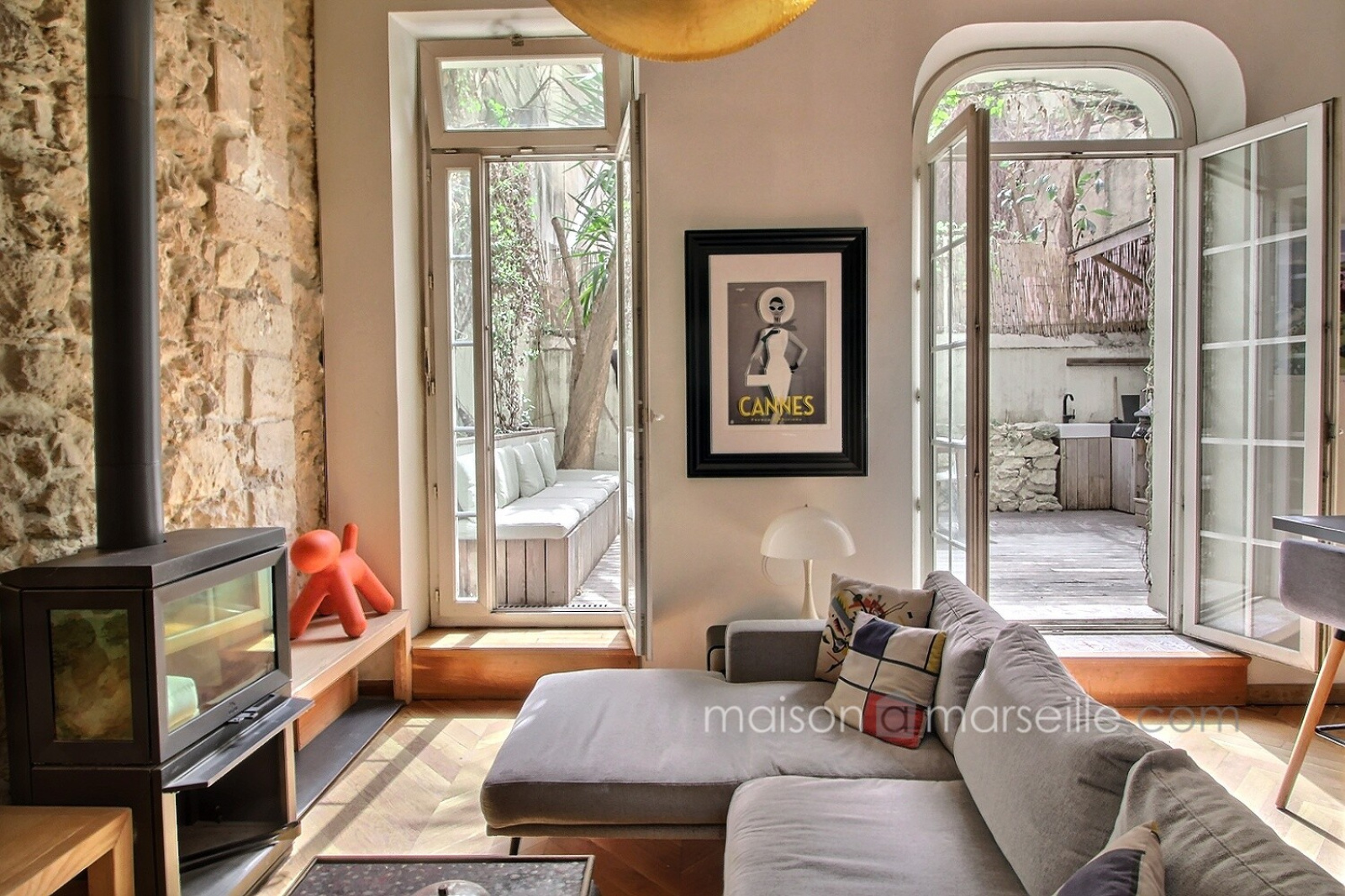 Un charme fou et des prestations et matériaux de très belle qualité pour cet appartement atypique niché au calme, proche du cours Julien et de la Plaine. Les matériaux et finitions sont remarquables. Le salon, doté d'un poêle et d'une belle bibliothèque en bois, donne par 3 porte fenêtres sur le jardin, plein de charme, qui prolonge naturellement l'espace et offre aussi une cuisine d'été, Un escalier en fer forgé accède à une pièce aujour'hui ouverte mais qui peut être vitrée fermée sur toute sa longueu et qui peut accueillir soit un bureau soit une chambre. Sous la mezzanine, communiquant de plain pied avec le salon, vous retrouvez également une chambre avec ses toilettes contigus cachés derrière une étagère porte . L'escalier principal discret descend vers un étage entièrement consacré au linge et au bien être: comme un boudoir, cet espace commence par un dressing sur mesure aux très belles portes de bois, puis l'on enchaine plus au fond vers la partie salle de bain et buanderie tout ausi raffinée. Idéal pour un couple ou un pied à terre au coeur de Marseille, proche du métro, des marchés, des restaurants et boutiques du Cours Julien et du quartier Chave et Camas.