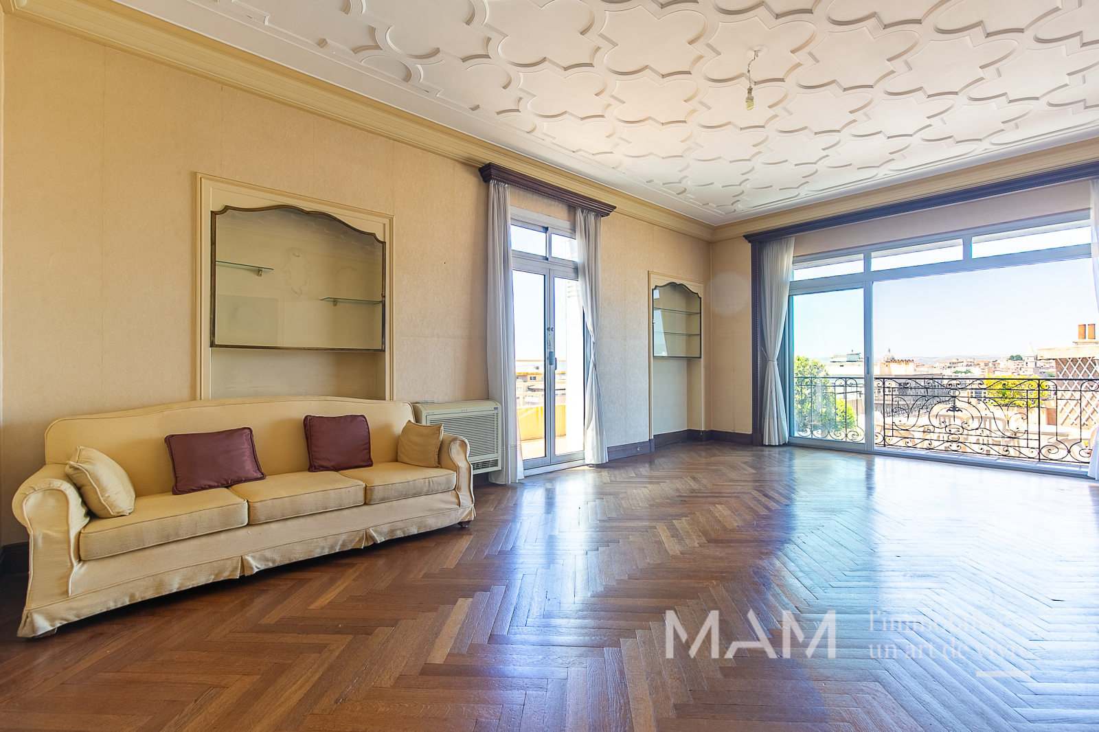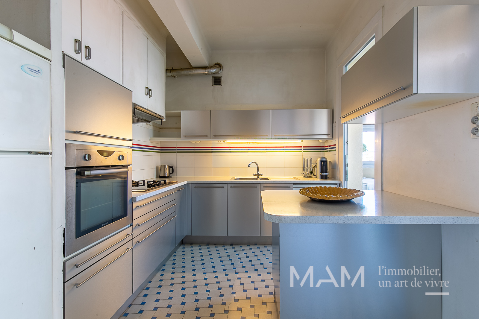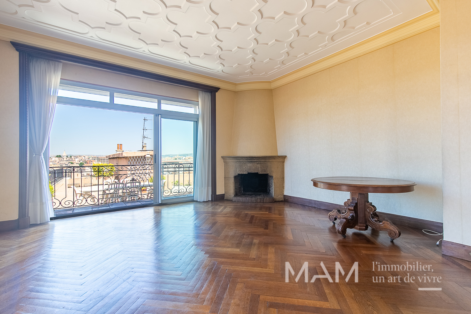 L'entrée de plus de 20m² s'ouvre côté Ouest sur un grand salon de caractère au plafond ouvragé prolongé par une terrasse de 80m² avec vue exceptionnelle sur la ville et le Vieux Port. La cuisine séparée jouxte cette partie de l'appartement et donne sur une loggia de 5,20 m2.
