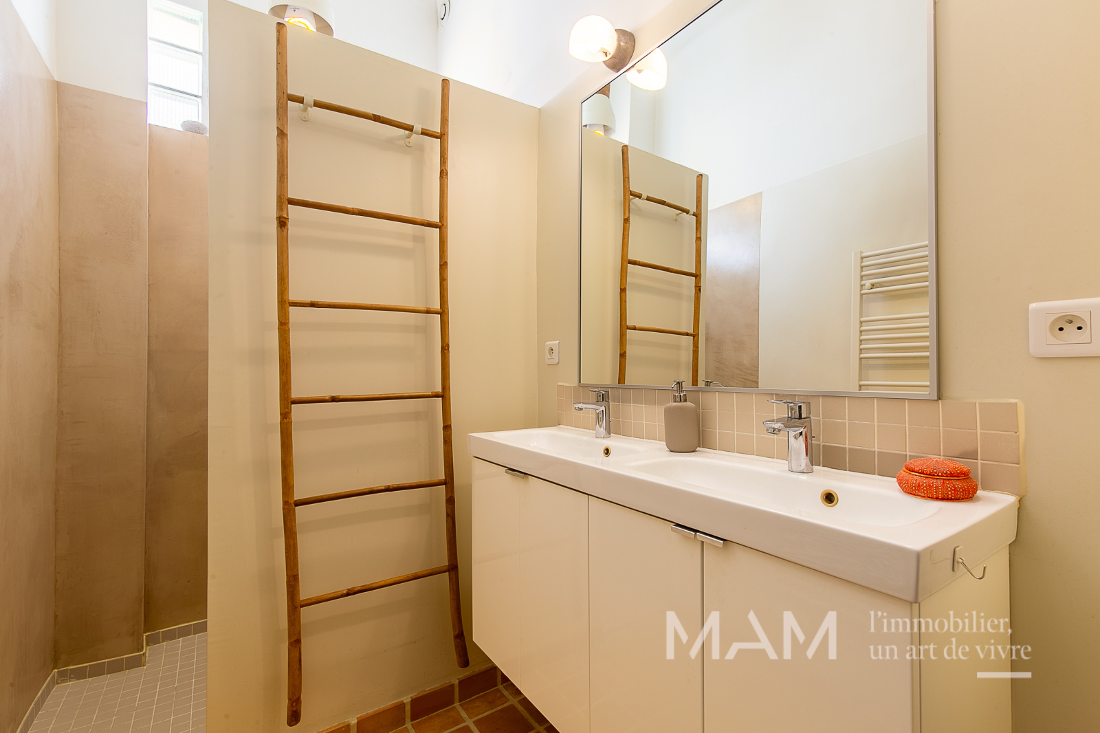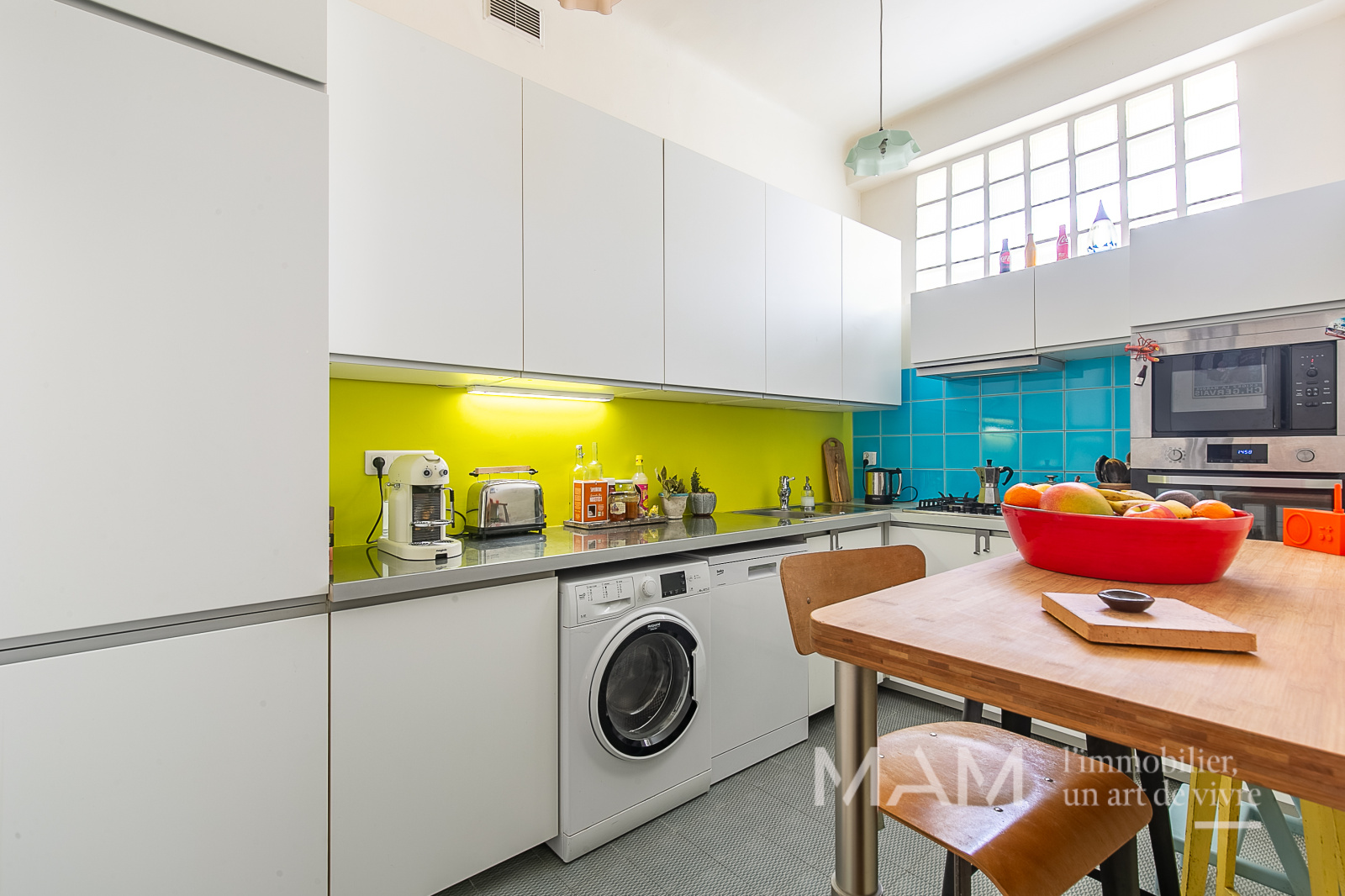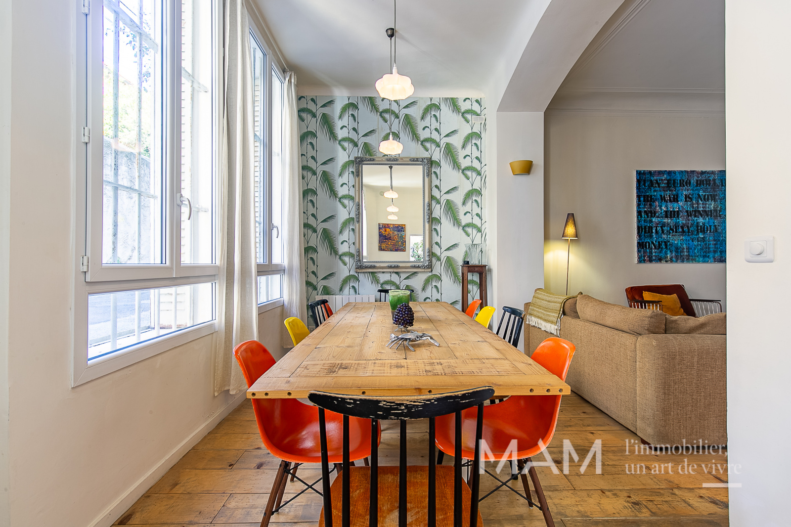L’entrée centrale de 13 m² dessert un vaste salon/salle à manger de près de 36 m², baigné de lumière, ouvrant sur une charmante cour privative de 6 m², idéale pour profiter des beaux jours. La cuisine, aménagée et équipée, séduit par sa verrière élégante.