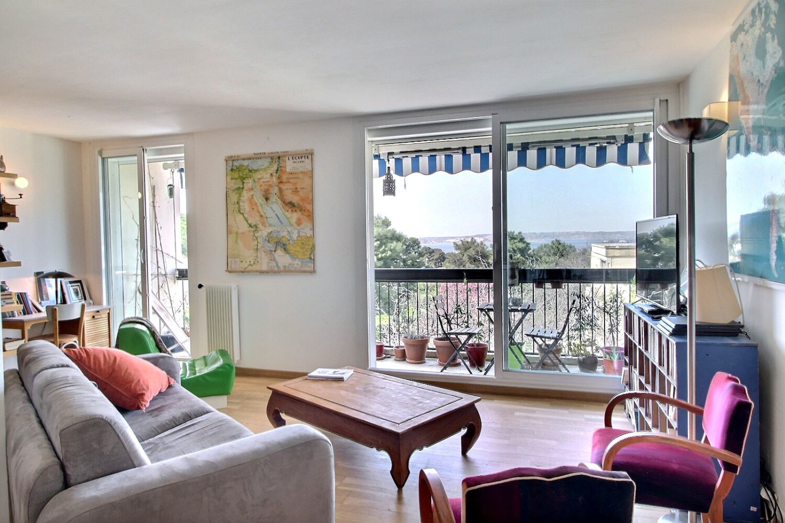 Au 2ème et dernier étage d'un petit immeuble situé au coeur de la pinède du roy d'Espagne, cet appartement lumineux et très calme offre de toutes ses pièces une jolie vue sur la mer et Notre Dame de la garde. La pièce principale donne sur un large balcon. La cuisine ouverte et son coin repas bénéficient également de la vue sur la mer dans ce grand espace de vie. L'espace nuit dessert 4 chambres, chacune a la vue également. Deux d'entre elles déservent un 2ème balcon. Grands placards dans le couloir. Appartement entièrement parquété. Une salle de bain complète ce bien. Wc séparé. Le chauffage est compris dans les charges. Cave. Local vélo. Proche des écoles et du lycée Marseilleveyre. Contact ML de Bryas 0603243478