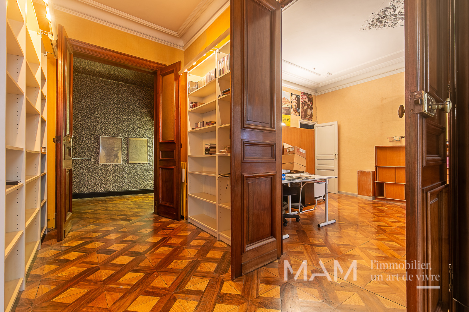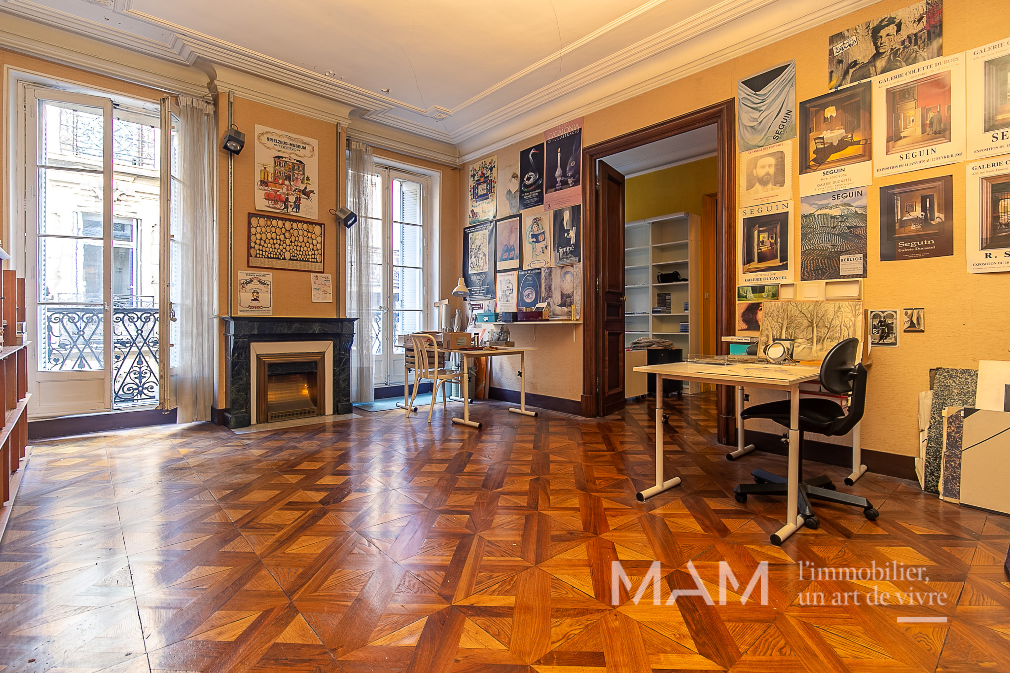 Grandes hauteurs sous plafond, parquets d’époque remarquables et volumes exceptionnels confèrent à ce bien une élégance rare et intemporelle.