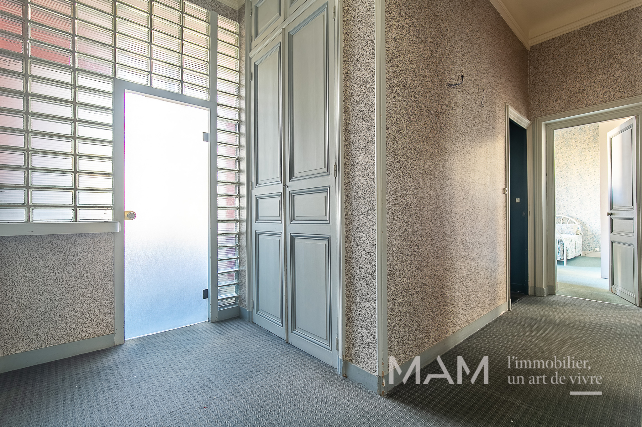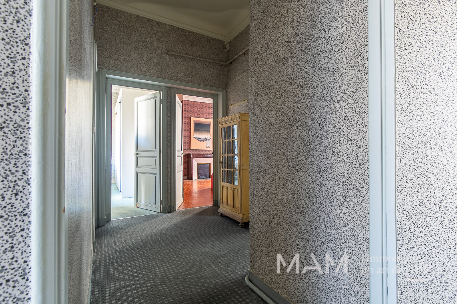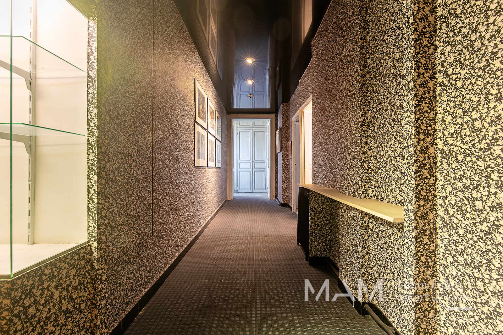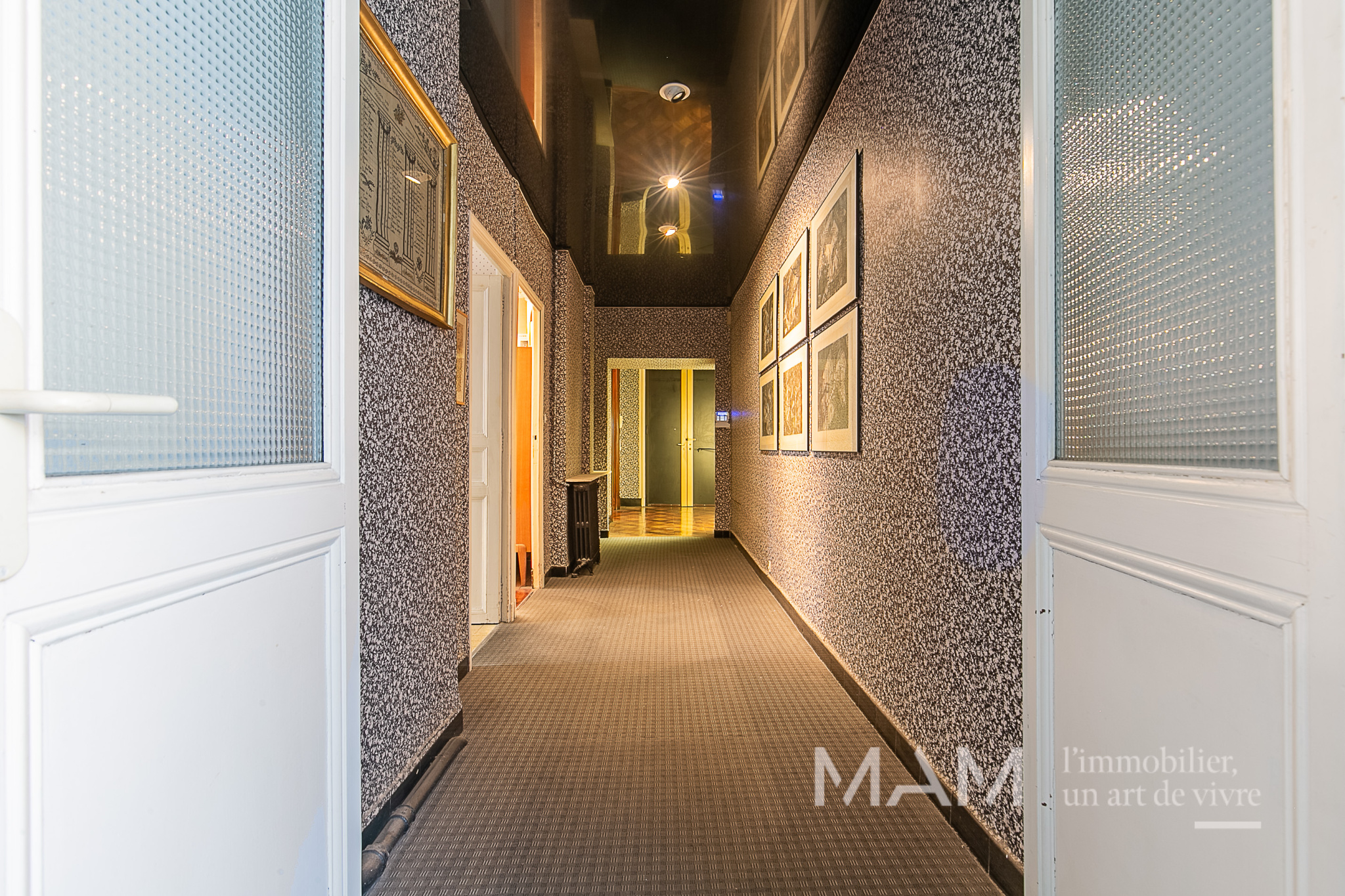 L’entrée et son corridor distribuent une triple réception de 75 m², idéale pour recevoir ou pour aménager un espace professionnel de standing, ainsi qu’une cuisine indépendante attenante.
