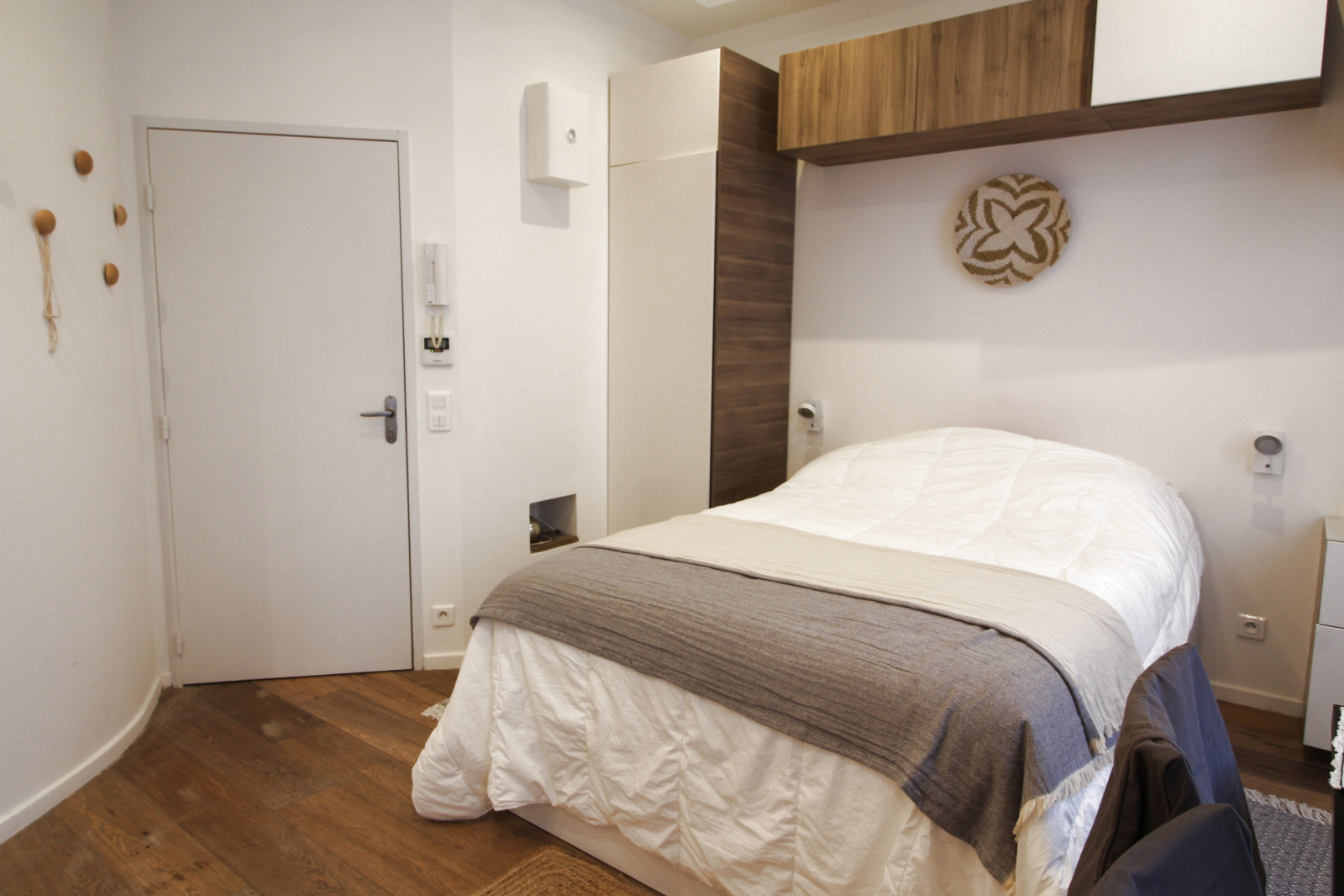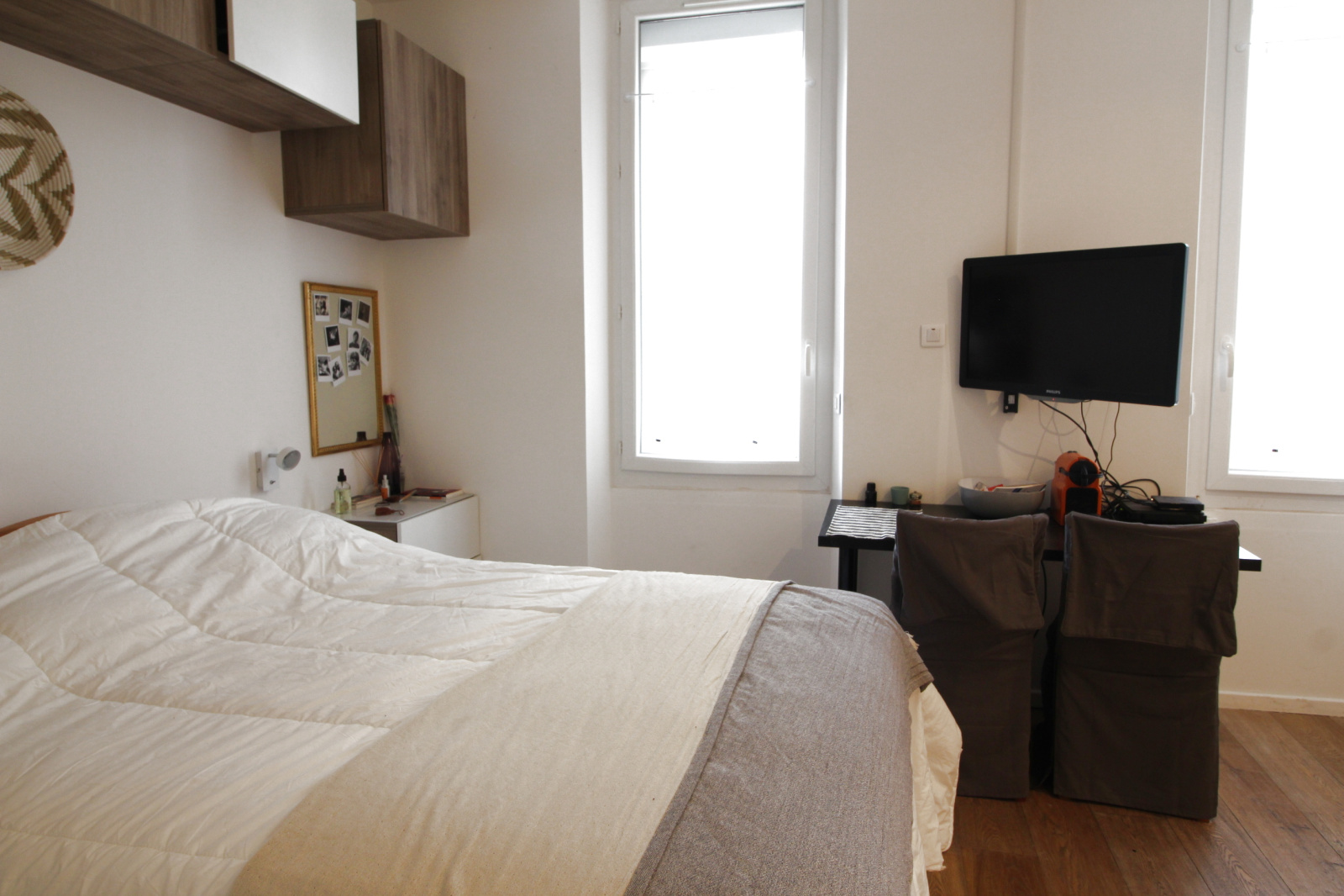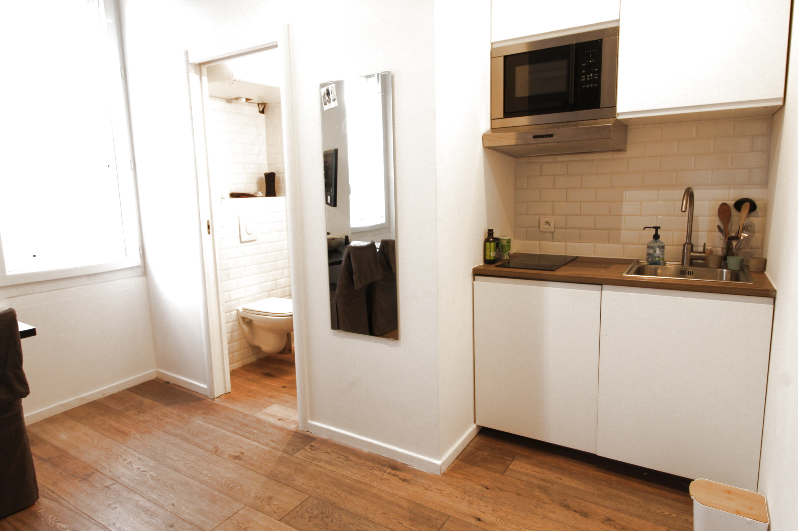 Studio meublé et entièrement rénové au 1er étage, avec kitchenette équipée, salle d'eau et wc.