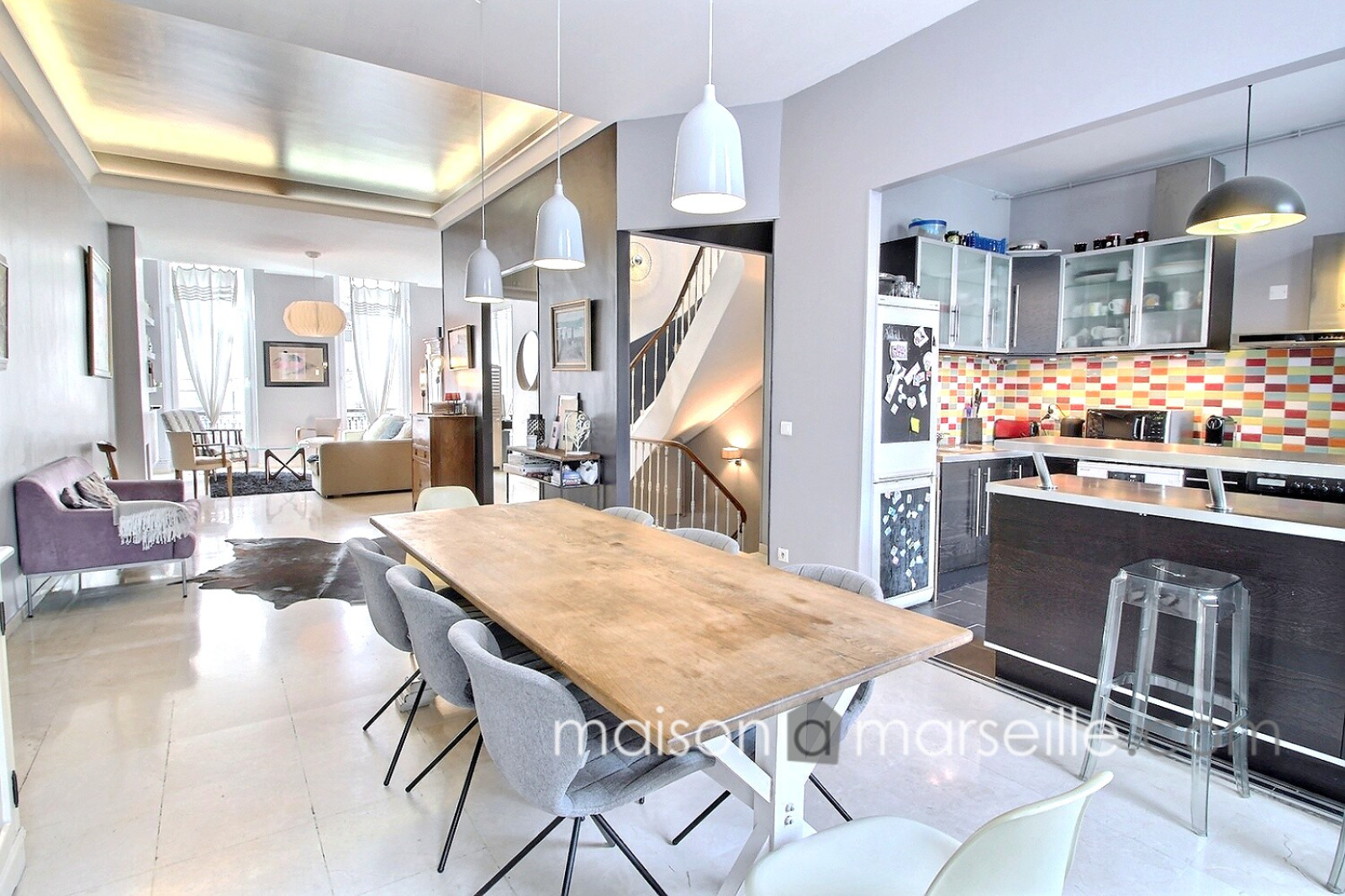 Appartement sur trois niveaux dans un immeuble marseillais situé rue Paradis. Comme une maison de ville, avec son entrée privative, on accède à l'appartement par un bel escalier qui mène à l'étage de vie au 1er étage : salon, bureau (possibilité d'une 5ème chambre) salle à manger et cuisine ouverte. Double vitrage performant côté Paradis exposé ouest, sur cour au calme côté est. Au deuxième étage : Trois chambres aux beaux espaces, une sur cour, deux sur rue, et une salle de bain indépendante avec une baignoire et une douche. Un troisième niveau mène à la vaste suite parentale sous combles avec sa salle de douche et terrasse privative. Buanderie. Accord de la copropriété pour réaliser une terrasse au 1 er étage de plain pied côté cour. Rare ! contact ML de Bryas 0603243478