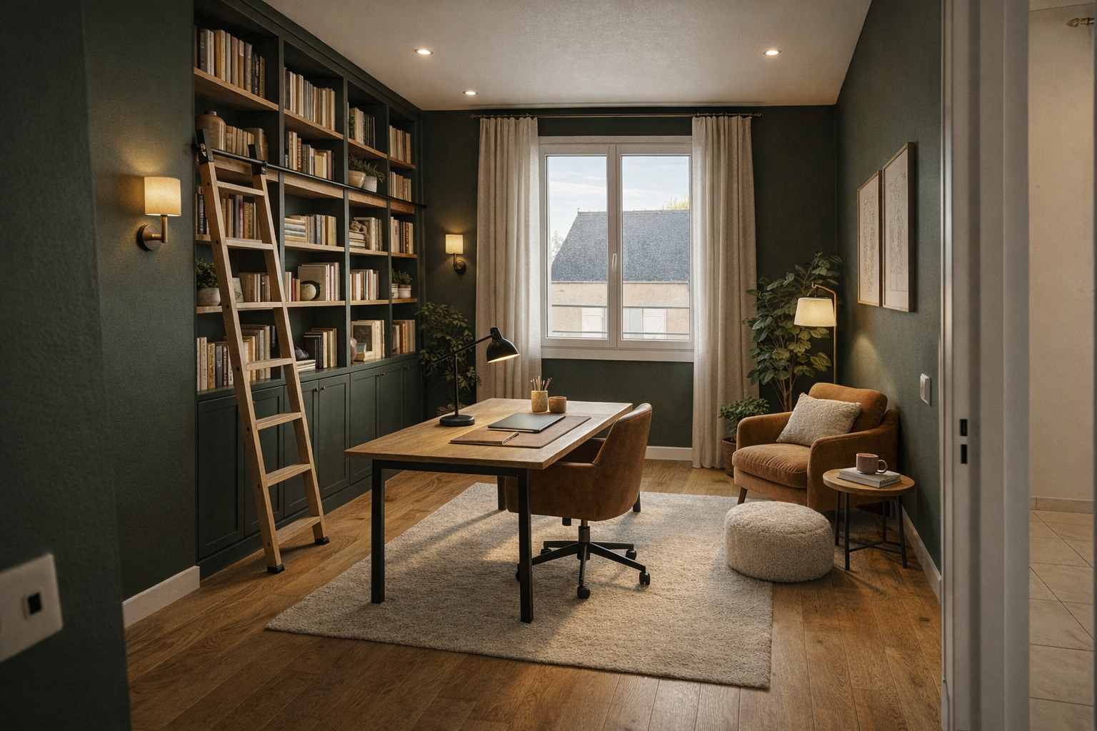 Un bureau complète cet espace de vie, parfait pour le télétravail ou une pièce polyvalente.
